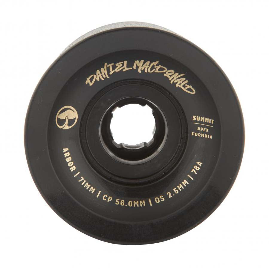 Summit är designat för att ta sig an tekniska utförsbackar och erbjuder en sällsynt balans mellan grepp och driftprestanda. Mellanvinklade kanter och Arbors 78A Apex Formula-uretan ger gott om grepp i snäva kurvor, medan en medelstor 56mm kontaktyta och en förskjuten Groovetube-kärna möjliggör smidiga övergångar in och ut ur slides.